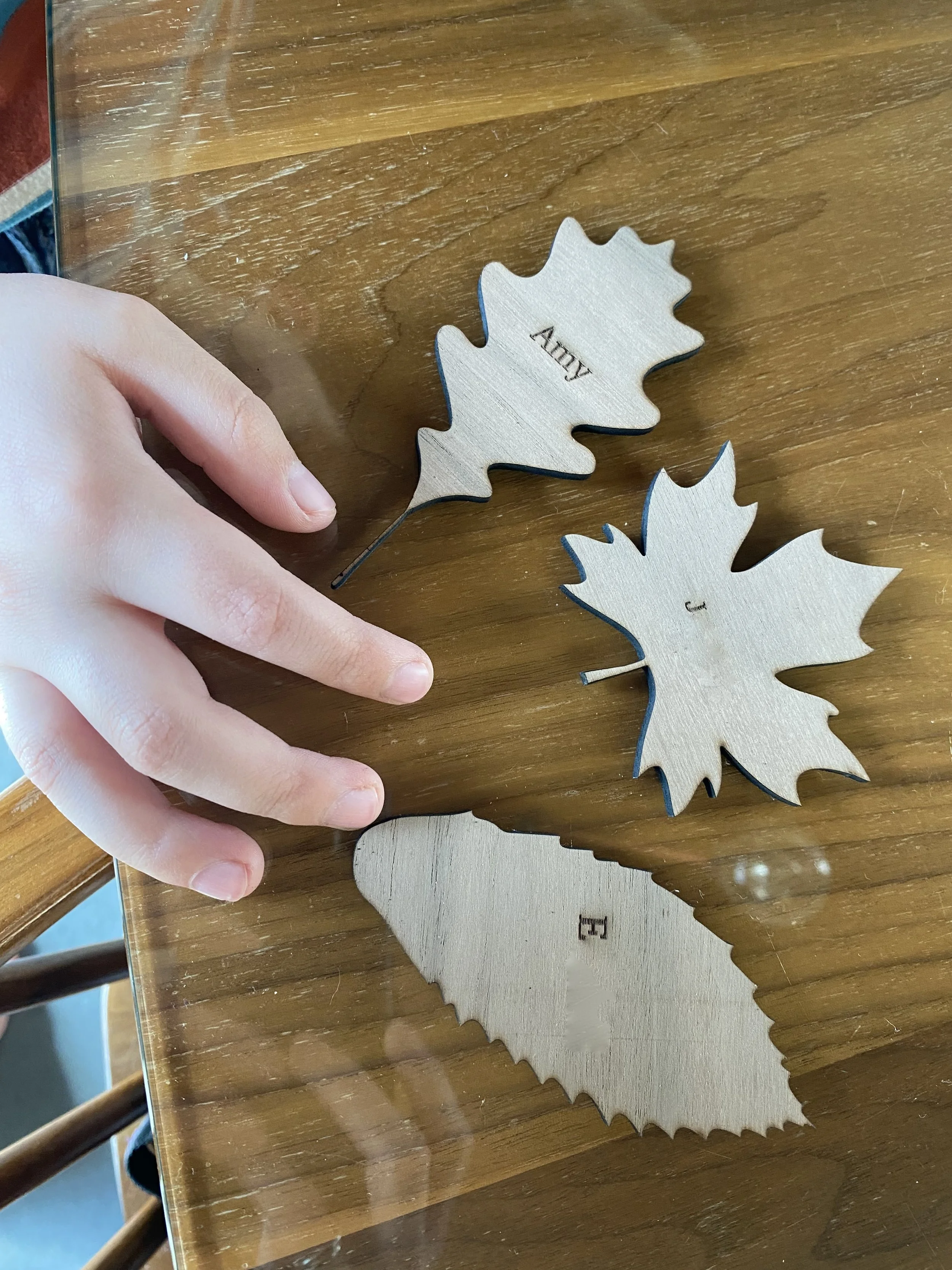 E also chose to work on owning the Thanksgiving table setup. He organized the tablecloth, dishes, and placement of guests. To support his cause, he created custom place cards with his own design which he printed on the laser cutter with walnut wood which he kept all natural.